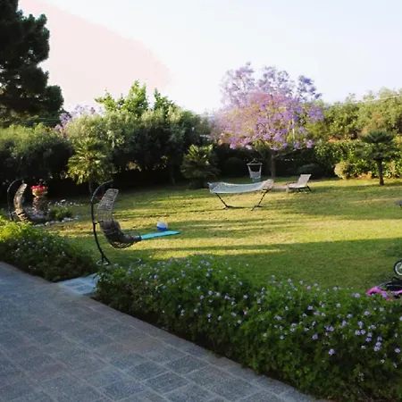 La terrazza vanta una vista sul giardino. La Luxury Villa "Ivone" In Almyros Beach - Private Villa Near The Sea dispone di un bagno con un bagno con WC separato e una doccia. Inoltre troverai asciugacapelli e asciugamani.